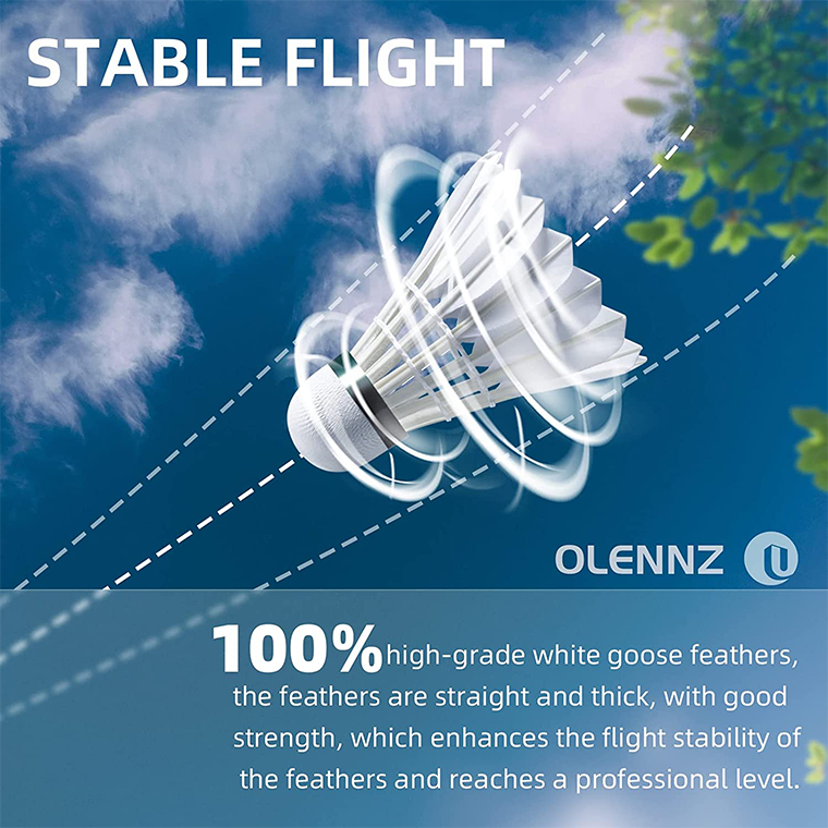 Each pack comes with 12 Badminton Shuttlecocks that are made of high-quality goose feathers with a solid cork head to enhance your badminton experience whether you’re playing indoors or outdoors by offering more stability, durability, and speed.We’ve designed the head of our goose feather badminton shuttlecocks using a 2 layers cork head, the upper is fiberboard, the lower is wood. ball head design along with durable cork that gives it more bounce which coupled with the lightweight and increased stability makes it easier to control. this shuttle will give you a perfect feel on each hit. We only use strong, straight, and thick goose feathers to ensure a steady flight path to ensure more stable shots and enhance the badminton resistance. And four to five times more durable than ordinary nylon shuttlecocks.